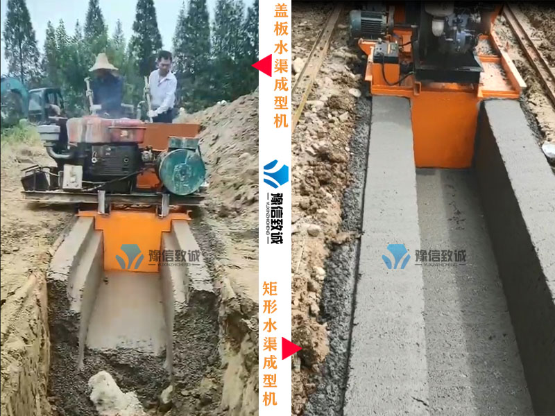 看過上面的圖片以后。我們發(fā)現(xiàn)這個帶蓋板槽的水渠假如使用人工修建是非常麻煩的事情。它不像一般的矩形水渠那樣,通過支模板可以一次成型。起碼他需要人工兩次制作。這樣下來人工的費(fèi)用就增加了很多。而使用蓋板水渠滑模機(jī)做這種規(guī)格: